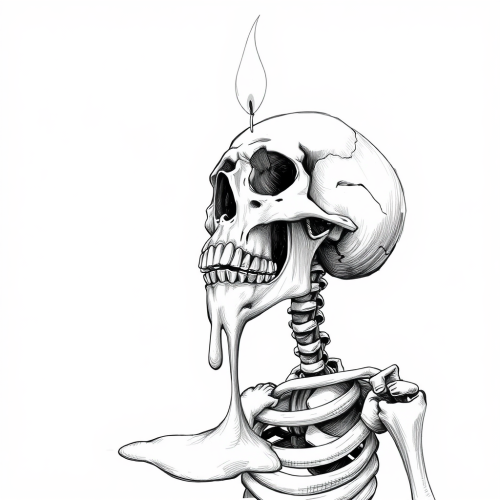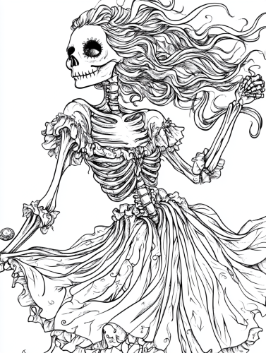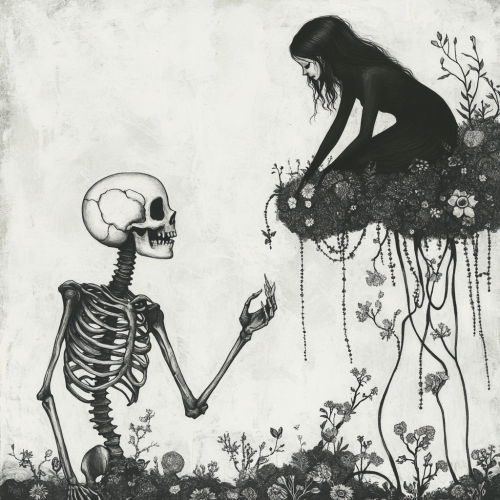 Illustrate a surreal, monochromatic scene that conveys a feeling of melancholy and fragility. At the bottom, depict a skeletal figure with hollow eyes, one hand reaching up, while its bones appear delicate, almost crumbling, and intertwined with flowers and plants growing from the ground around it. The skeletal figure has strands of dark, spiky hair, and its posture is hunched, as if weary yet yearning. Above, portray a woman sitting gracefully on a cloud, her expression somber yet compassionate as she gazes down at the skeleton. She has long, flowing black hair cascading over her shoulders, and a small, tilted crown rests on her head. The cloud beneath her is textured with intricate, swirling circular patterns that create a hypnotic effect, almost like ripples or spirals. The scene should use a soft, muted black-and-white color palette to enhance the dreamlike, ethereal quality. The composition should emphasize a sense of separation between the two characters, with the woman elevated on the cloud, almost celestial, while the skeletal figure remains grounded, embedded in nature. Capture the delicate connection between them, as though they are reaching for one another in an expression of vulnerability and longing. The artwork should feel introspective, surreal, and filled with symbolic imagery, hinting at themes of mortality, connection, and transformation.