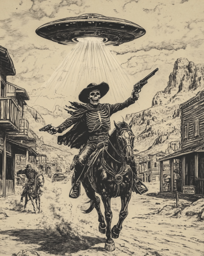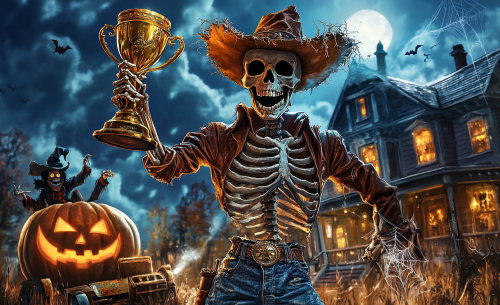 a halloween skeleton wearing a cowboy hat holds a golden trophy in the air while he stands in front of his old house with spider webs, a mad pumpkin in the background is riding a lawn mower, --ar 18:11