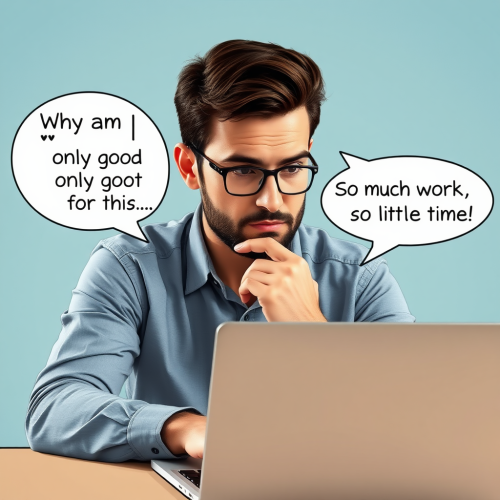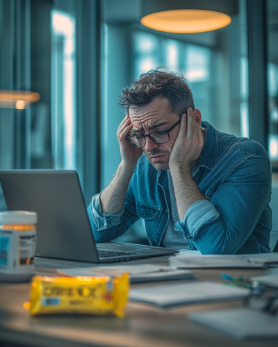 A man in his late thirties sitting at an office desk, with glasses and short hair wearing blue jeans shirt , holding head between hands looking sad while working on laptop . He is dressed casually but smartly . The room has a modern design with glass walls and soft lighting. A yellow packaging energy bar laying on the table advertising style in full focus very visible. There's energy bar nearby, papers scattered around the table, and a few books visible behind him, the man is looking at the energy bar, Shot by Nikon D850 DSLR high resolution camera lens perspective wide shot full body --ar 4:5