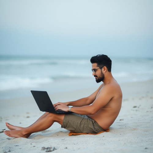 a pale streesed out unatractive man in his 30s wearing a black hoodie and headphones hunched over intensly working on his laptop at the beach on a sunny day while beautiful women in swimsuits are running around having fun