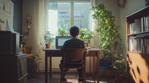 A woman working on a laptop from a cozy home setup, taken from behind or over the shoulder, in a well-lit room with natural sunlight streaming in, showing only her hands on the keyboard, a coffee mug nearby, and a serene background. --ar 2:3 --style raw --s 250