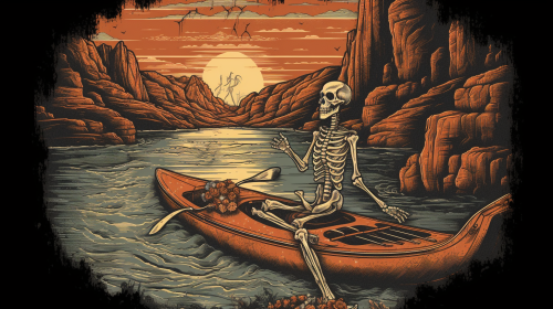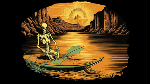 A vintage 1980s rock and metal t-shirt design featuring a side profile of a skeleton paddling away on a vividly decorated paddleboard across the shimmering surface of Lake Mead, a vast desert lake surrounded by rugged, arid cliffs and rocky shorelines. The skeleton, wearing a tattered bandana and aviator sunglasses, leans forward with the paddle gripped tightly, creating ripples in the water. The paddleboard stands out with neon flames, skulls, and lightning bolts in bright pink, blue, and yellow. The setting sun casts deep orange and purple tones across the lake, with stark, jagged desert mountains silhouetted against the sky. Styled as a retro screen-print, the artwork uses heavy black outlines and intense neon colors that reflect the rebellious spirit of 1980s rock and metal culture. The skeleton's side profile is dynamic and sharply detailed, and the bright, graphic elements of the paddleboard create a bold contrast against the muted desert landscape. Jagged lines and electrified edges frame the design, adding an extra punch of visual intensity. The lighting features the blazing glow of a desert sunset, with dramatic light rays piercing through the sparse clouds, highlighting the skeleton and paddleboard while casting long shadows across the lake’s surface. The scene captures a blend of warm and cool tones, creating a dynamic and energetic composition. --ar 16:9 --s 300 --v 5.0