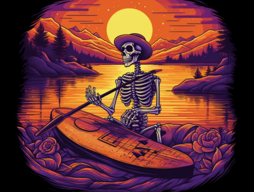 A vintage 1980s rock and metal t-shirt design featuring a skeleton with a grinning skull, wearing sunglasses and a bandana, standing confidently on a paddleboard in the middle of a serene lake. The skeleton strikes a dramatic pose with a guitar slung across its back, catching the last rays of a vivid orange and purple sunset. The lake reflects the brilliant colors of the sky, and distant silhouettes of pine trees line the horizon, adding depth to the scene. The design has bold, distressed fonts and vibrant colors reminiscent of classic rock band merchandise from the 1980s. In a retro screen-print style, the art features heavy black outlines with sharp contrasts, using bright, eye-catching colors such as neon pinks, purples, oranges, and blues. The texture is gritty and slightly faded, evoking the look of a well-worn, vintage concert tee. Stylized flames and lightning bolts frame the edges, adding dynamic energy to the composition. The lighting captures the dramatic hues of a setting sun, with golden and magenta rays casting long shadows across the lake's surface. The reflection on the water shimmers with a mix of dark blues and fiery reds, creating a vivid contrast against the skeleton's stark white bones. --ar 4:3 --s 300 --v 5.0