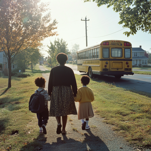 80’s black mom walking her kids to the school bus the family is faced backwards In Connecticut sun is shining beautifully shot in Fuji superia X-TRA resembles 80’s readers digest architectural drawings