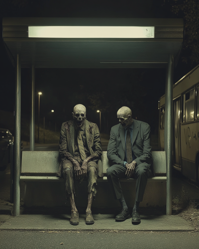cinematic still, documentary photography, night spooky bus stop, 2 headless zombies sitting at bus stop with their heads resting on their legs, in the middle of these 2 zombies, sits a man in a suit and tie visibly worried about waiting for the bus with these zombies near him, well lit scene, , wide shot, front shot, --ar 4:5 --style raw