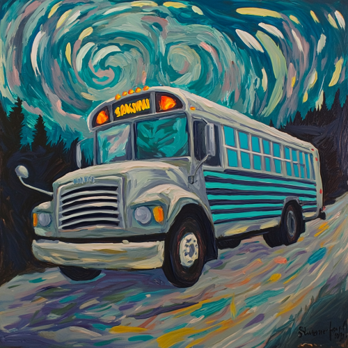 painting of a gray school bus with teal strips at night, in the style of neo expressionism, whistlerian, vincent van gogh, oleg shuplyak, sol lewitt, emotive fields of color, swirling vortexes
