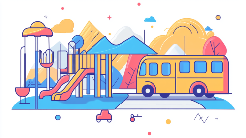 A geometric flat illustration of school playground featuring a slide, swings, merry-go-round, and monkey bars with a bus parked on the road. Ultra minimalist design elements using basic geometric shapes, patterns, and form with no shading on a white background. Clean lines and simple forms to represent playground equipment.. --ar 16:9 --v 6.1