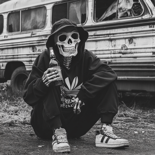 A skeleton who is squatting in front of an old school bus, its holding a bottle of alcohol and is wearing a bucket hat and hoodie, black and white --v 6.1