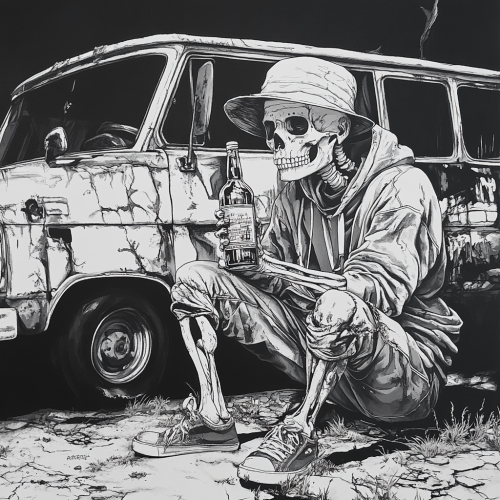 A skeleton who is squatting in front of an old school bus, its holding a bottle of alcohol and is wearing a bucket hat and hoodie and adidas style sneakers, doodle style, black and white --v 6.1