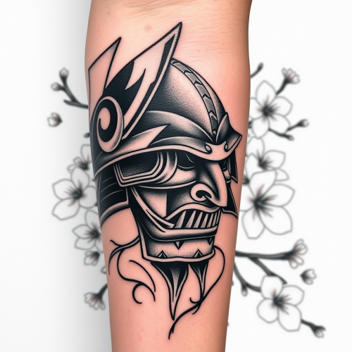 Tattoo design of the Skull hannya mask. Holding katana. Flowers in the background. Black and grey. Detailed online work. Photorealism. Powerful. Side profile. Full arm --style raw --s 750 --ar 9:16 --v 6.1