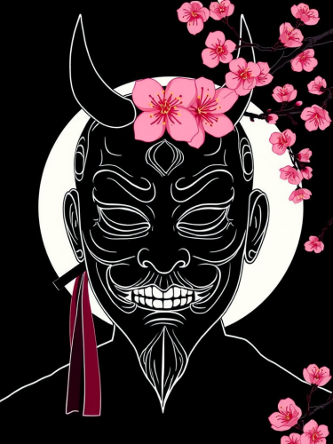 Tattoo design of outline of samurai hannya mask with skull, very detailed line work, side profile, dark shading, cherry blossom flowers in background --ar 9:16