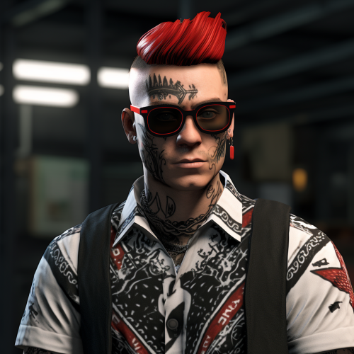 gta style, white male with split black and red mixed hair, 4k , skull half mask, clear frame glasses