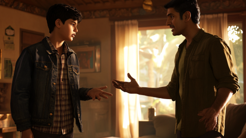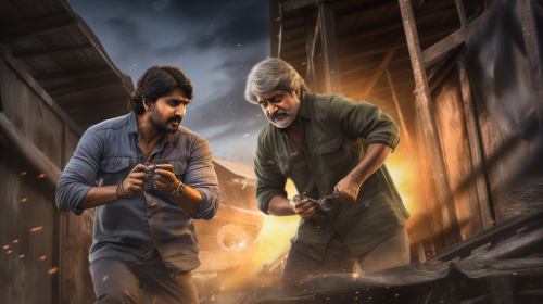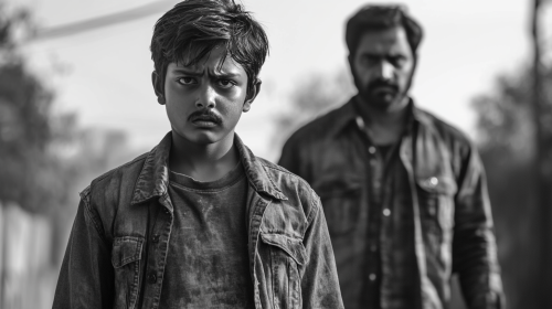 a 13 years south indian boy standing out of fear. fear in his eyes, standing behind a sound indian hero who is in his 30s with intensive looks. kid wearing tshirt and a jacket over the tshirt and a denim jeans. --ar 16:9