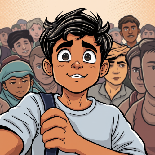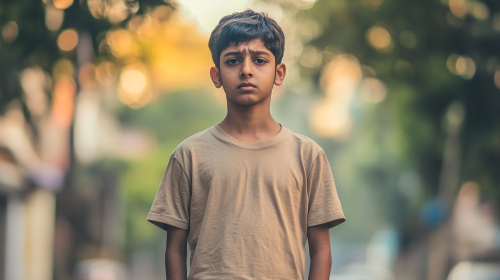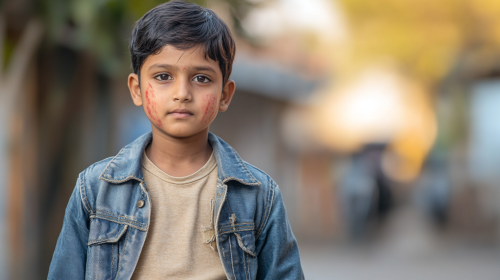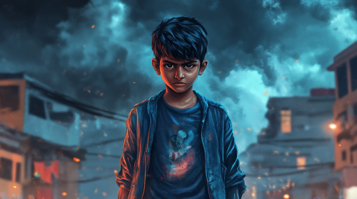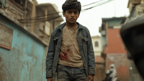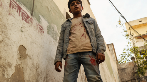 A full-body shot of a South Indian boy, around 13-14 years old, wearing denim jeans, a beige t-shirt, and a jacket. He looks very fear, with signs of a chase and red marks on his on his body. The camera angle is slightly low, capturing the intensity of the moment and the boy is looking above the camera which is slightly up, --ar 16:9