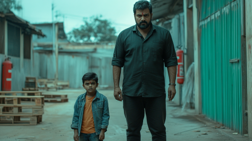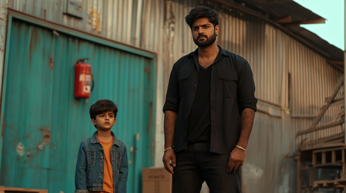 generate an image of a south indian hero in his 30s standing in an empty warehouse or industrial area. He is wearing a plain black shirt, and dark pants. He has a beard and is looking off with a serious, intense expression as if he is there for the boy. Slightly behind him, a young boy, around 10-12 years old, with short dark hair and wearing a denim jacket over an orange t-shirt and jeans, stands nervously, his face showing clear fear. The boy is glancing around cautiously, staying close to the man as if for protection. The warehouse is made of corrugated metal and has a green door with a red fire extinguisher hanging on it. There are wooden pallets scattered around the area. The sky is blue and the overall mood of the image is somber, --ar 16:9