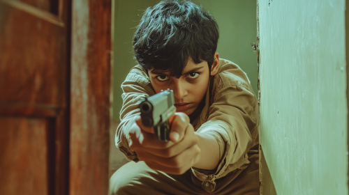a 13 years south indian boy wearing shirt pant and a jacket is crouching down at the door as if he is hiding and aiming gun towards the first person and looking at him intensively. The color palette should feature olive green and light brown shades for wood. --ar 16:9