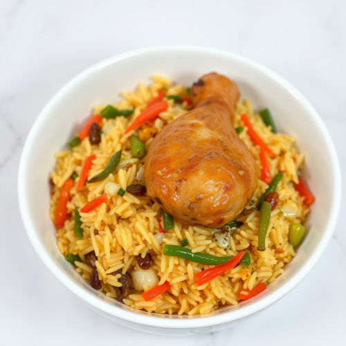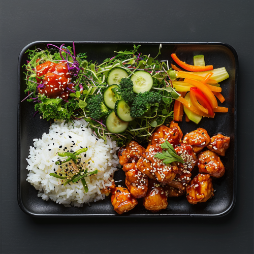 Restaurant menu board design, korean chicken, coleslaw, rosted vegetables, a scoop of rice on the retangular plate, modern, clean looking --s 250 --v 6.0