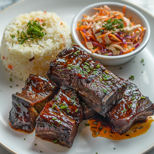 Product photography of Braisied korean beef short rib served with a scoop of rice, along with a cup of coleslaw, all on a white retagulart plate --s 250 --v 6.0