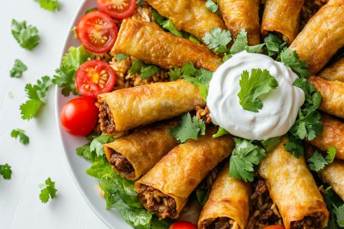 STYLE: Close-up Shot Top view | EMOTION: Tempting I SCENE: Beef Taquitos Rice Casserole A delicious-looking, giant plate of deep-fried flautas with a brown filling and white sour cream on top, surrounded by slices of red cherry tomatoes, garnished with fresh leaves of coriander or cilantro, against a white background, in the style of professional food photography. | TAGS: High-end food photography, clean composition, dramatic lighting, luxurious, elegant, mouth-watering, indulgent, gourmet | CAMERA: Nikon Z7 | FOCAL LENGTH: 50mm | SHOT TYPE: Close-up | COMPOSITION: Top view Centered | LIGHTING: Soft directional light | PRODUCTION: Food Stylist --ar 3:2