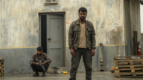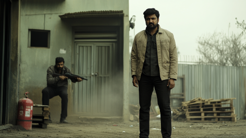 Two South Indian men in an outdoor setting, with at least 10 meters of distance between them. The man in the foreground is standing and looking straight ahead. He is wearing black pants and a beige jacket over a shirt, positioned in front of a gray building that has a door and a window. A little dust floats in the air around him. In the background, near the door, a second man is crouching down and aiming gun towards the first person and looking him intently. The color palette should feature olive green and light brown shades. There is a fire extinguisher mounted on the building's wall, and a pile of wooden pallets on the ground nearby. The ground is covered in dirt, with a fence in the distance. The atmosphere is rugged and slightly dusty. --ar 16:9