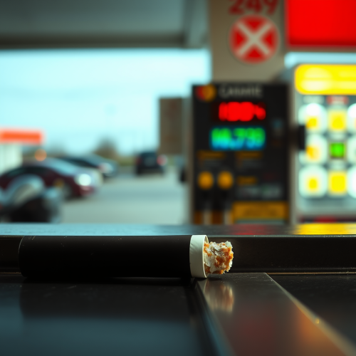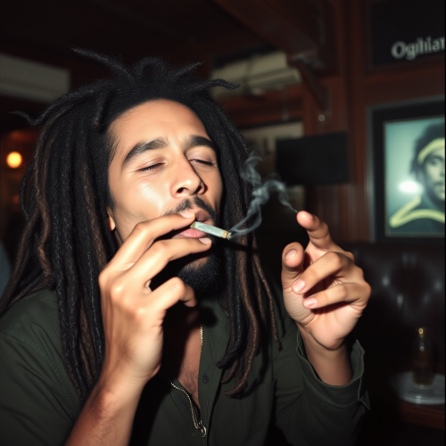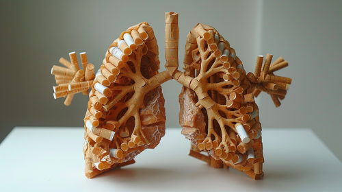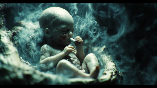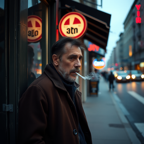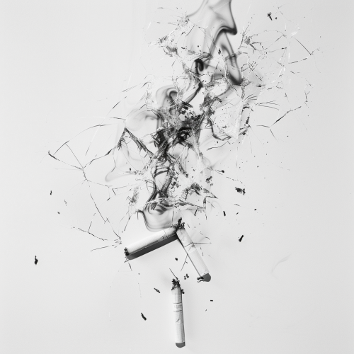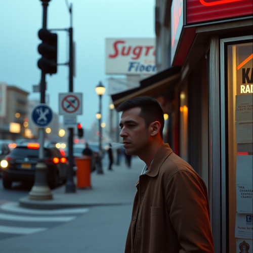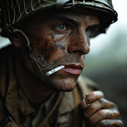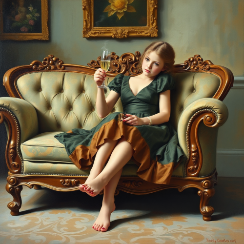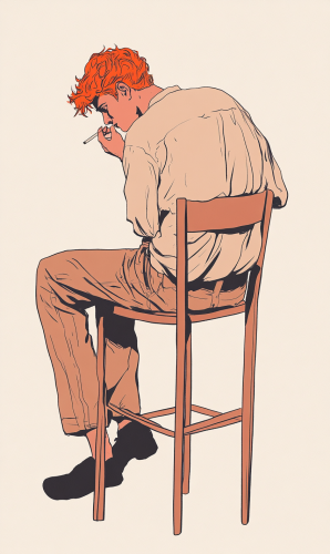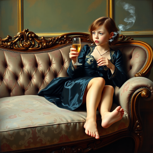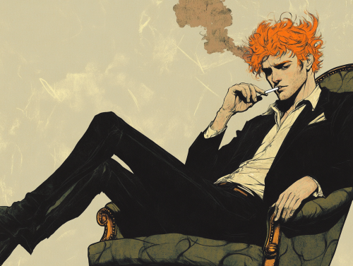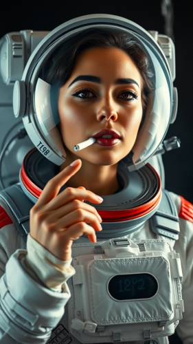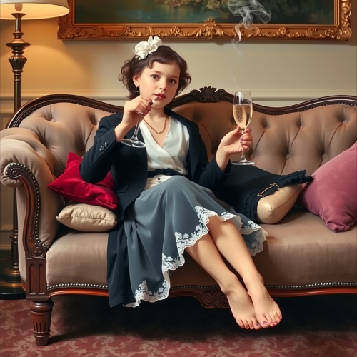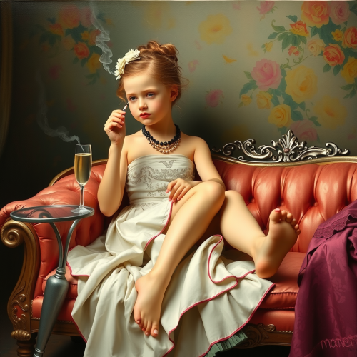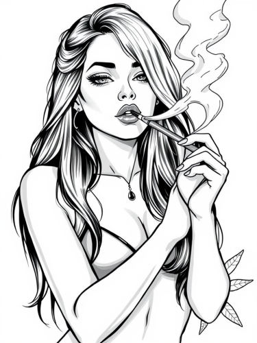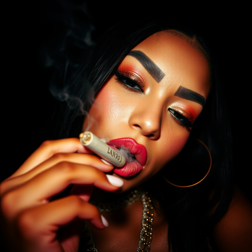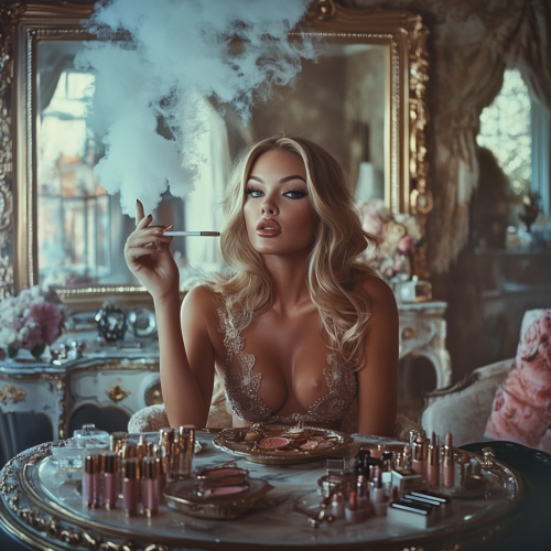 Imagine/ a beautiful 32 year old woman sits at a makeup table in her beautifully decorated luxurious bedroom in Los Angeles. She is holding up and away with two fingers a thin white cigarette with smoke coming from its tip. There are several small open tubes of lipstick on the table. She sit at the table. She has medium length blonde hair. Big chested. She is wearing black winged eyeliner. She had curled eyelashes. She is wearing golden eyeshadow on her eyelids. She has dark red glossy lipstick on her big lips. Highly detailed. 4k image. Extremely detailed. High resolution photo.