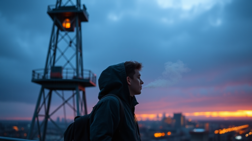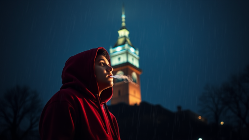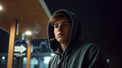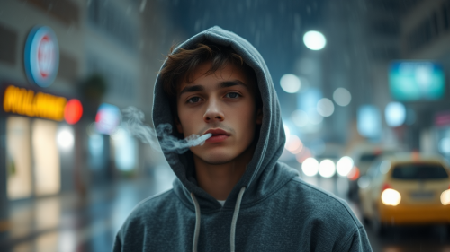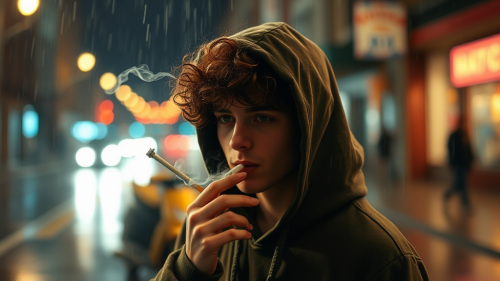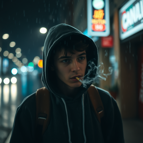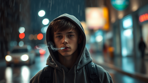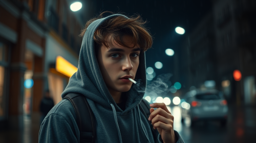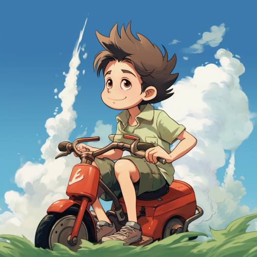 A kid smoking a cigarette on a moped done in the style of studio ghibli, 90's anime