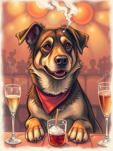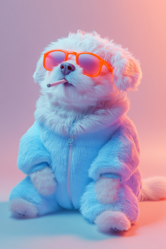 A fat, white dog in the style of cute, pastel color palette, wearing a blue fluffy tracksuit and orange glasses with pink lenses, smoking a cigarette. Full-body portrait, blurry background, pastels, soft lighting, pastel colors, dreamy, surrealism, vaporwave, in the style of James Jean and Hiroshi Nagai. 3D render, Octane render, white gradient background. --ar 2:3
