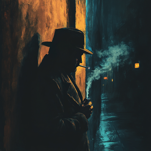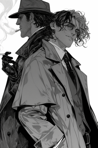 a cover for a noir novel; with, in the center of the image, on 2/3, two full-length men, back-to-back, one handsome,with shoulder-length hair, smoking a cigarette, wearing a borsalino hat; the other, cute, shorter, with a huge smile; black-and-white illustration; steampunk style; --ar 2:3 --niji 6