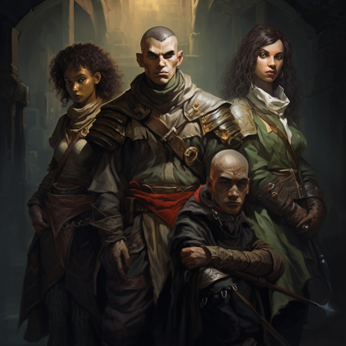 group of adventurers, dnd: male monk, young, bold and shaved; male warrior, curly hair, aristocratic; male elf, rogue, face hidden under hood; female orc small girl