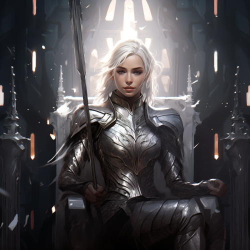 a digital art of a female 25 year old cute pale white elf with long ears, grey bright eyes, silver short hair, in a silver black armor and a longsword, on a throne in a dramatic lighting room of royalty