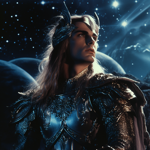 dvd screengrab, dark fantasy film from 1982, high elf warrior from world of warcraft with long pointed elven ears, wearing silver armor, night sky above him, full moon, lots of stars