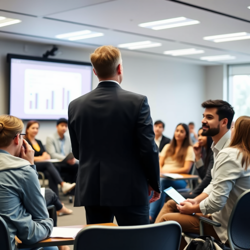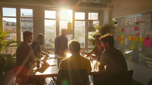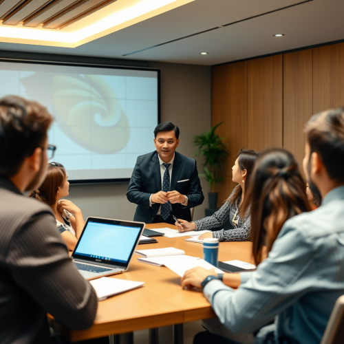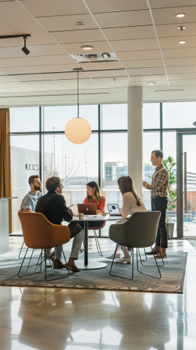imagine prompt: A group of diverse professionals collaborating in a modern office, attentively listening to a presentation, clear communication, focused atmosphere. Large windows allow natural light, minimalist decor. Soft shadows contrast the brightness, clean professional setting. Created using: modern interior design, soft lighting, corporate attire, hd quality, natural look --ar 16:9 --v 6.0