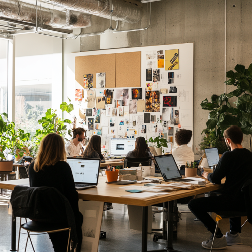Picture a modern, open-concept design studio filled with diverse groups of designers working together. Large communal tables are scattered with sketches, prototypes, and laptops. On a wall, there's a vibrant mood board showcasing different design ideas coming to life, with team members discussing and refining concepts. The atmosphere is buzzing with creative energy, highlighting a shared commitment to success.