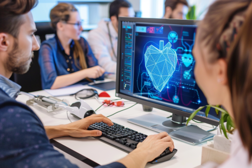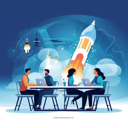 A vibrant, modern corporate workspace with diverse professionals collaborating seamlessly. Visualize people actively sharing ideas on sleek screens and digital devices, with streamlined data flows represented by glowing lines or holograms connecting workstations. High-tech software interfaces, analytics dashboards, and cloud-based tools are seamlessly integrated into the scene. Hardware elements include advanced computers, tablets, and smart boards. The environment feels open, friendly, and efficient, with natural light and a touch of greenery to reflect innovation. The overall tone is one of speed, connectivity, and accessibility, showcasing a collaborative approach to rapid information sharing.