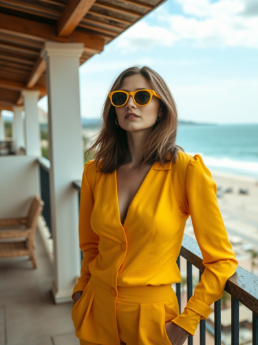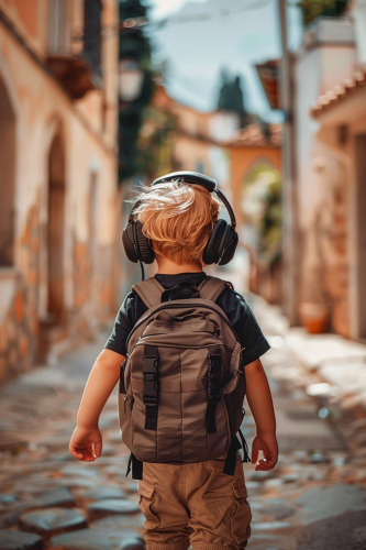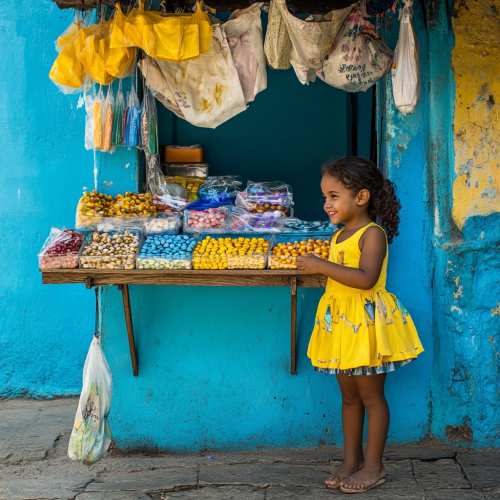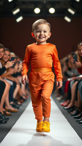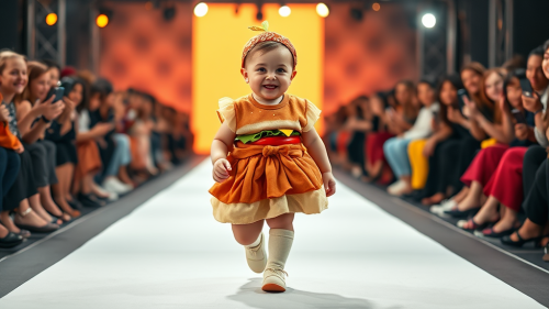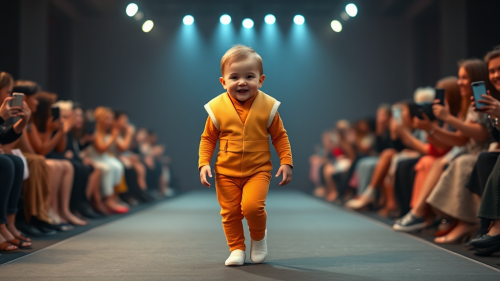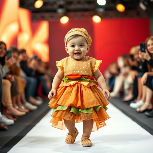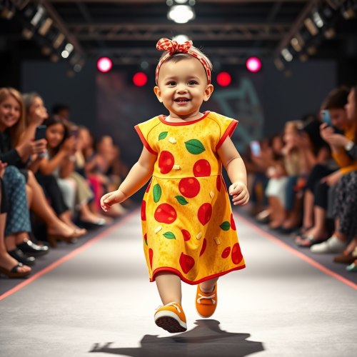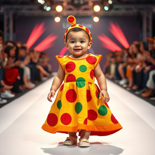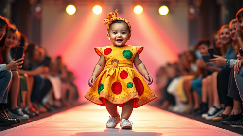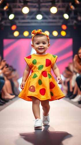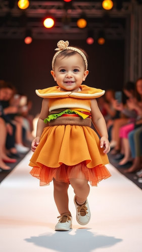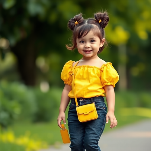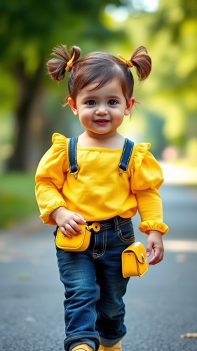 A high-quality, adorable digital image of a young child around two to three years old, with chubby cheeks, styled in trendy and fashionable clothes. The child is wearing a yellow, puffed-sleeve, off-the-shoulder top paired with dark, high-waisted jeans, accessorized with a small yellow handbag. The child has brown hair styled in two playful, symmetrical buns with matching yellow hair ties. She is walking confidently on a path in an outdoor park setting with blurred green foliage in the background, showcasing a joyful expression. The lighting is warm, enhancing her rosy cheeks and vibrant clothing.