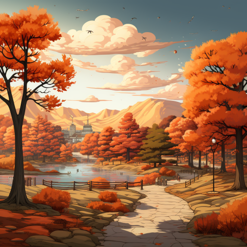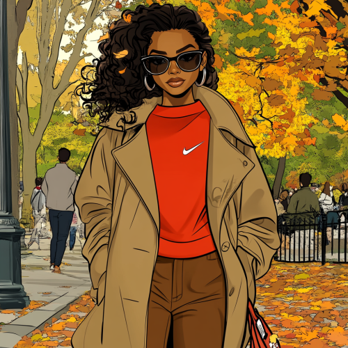 webcomic Walking in the park fall leaves falling from the trees, A mahogany skin complexion slightly plump woman flawless makeup designer black glasses brown eyes, long nails, wearing a camel brown trench coat oversized red sweatshirt camel brown pants red Nike dunks high top sneakers, dark brown coily, curly bob 64k hdr high definition bold details colorful scenery with other people around Nikon 55mm camera f5/6 focus