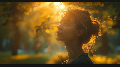 A person aged 42 or older with a refreshed, energized expression, stretching or walking outdoors in a serene, well-lit park during early morning. Minimal greenery and soft morning sunlight filtering through the trees create a calming, uplifting atmosphere. Simple, natural setting. --v 6.0 --ar 16:9 --style raw --s 750