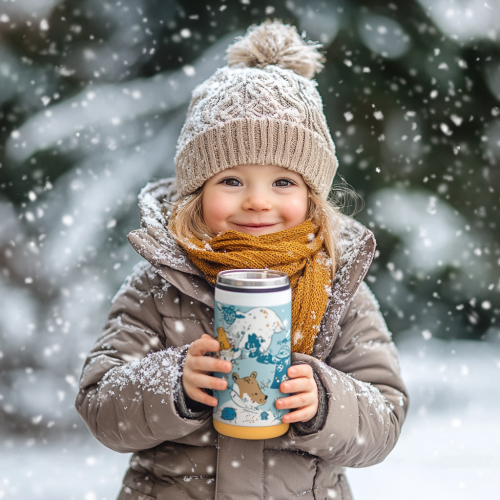 Winter scene with a young child around 6-8 years old, bundled up in a warm coat, hat, and scarf, holding a colorful insulated thermos cup in a snowy park. Soft snowflakes falling around, and snow-covered trees in the background. The child’s thermos has a playful winter-themed design with snowflakes and animals, matching the winter vibe. The child is smiling with rosy cheeks, looking excited. The mood is cozy and joyful, with soft lighting that captures the magic of winter –– photorealistic, gentle colors, winter wonderland aesthetic.