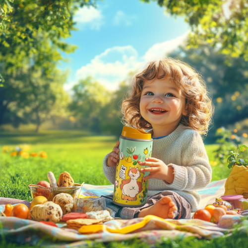 Bright, cheerful scene of a young child around 5-7 years old, sitting on a picnic blanket in a sunny park, holding a colorful insulated kids' thermos cup, lush green trees and blue sky in the background. The child is smiling and dressed in casual outdoor clothing, surrounded by a few healthy snacks and toys. The thermos has playful, cute animal illustrations on it, and the colors are vibrant. The mood is happy and energetic, with soft lighting that captures the warmth of a sunny day –– digital illustration, photorealistic, vibrant colors.