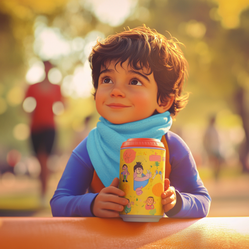 Post-exercise scene with a young child around 7 years old resting on a park bench, holding a colorful insulated thermos cup with cute illustrations. Dressed in activewear, the child looks happy and refreshed, with a small towel around their neck. Background of a sunny park with people jogging or biking in the distance. Bright and vibrant colors, capturing the refreshing moment after play. The mood is healthy and uplifting, with soft lighting emphasizing the warmth and energy –– photorealistic, vibrant and refreshing colors.