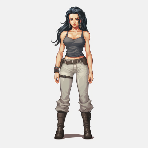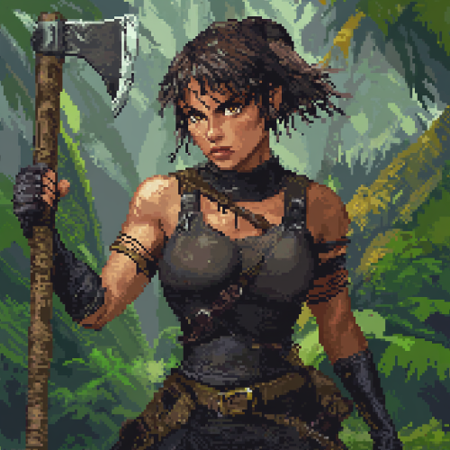 Create a pixelated Nintendo DS art style image of Johanna Mason, seen during the 75th Hunger Games (Quarter Quell). Johanna is a fierce and defiant tribute with short, dark hair and piercing brown eyes. She is dressed in the tribute arena outfit, which is designed for the jungle environment of the Quell. Johanna holds an axe in her hand, her posture strong and unyielding. The background shows the tropical landscape of the arena, with towering trees and a tense atmosphere as she prepares for combat. Her expression is filled with both anger and determination, reflecting her bitter attitude towards the Capitol and the Hunger Games system