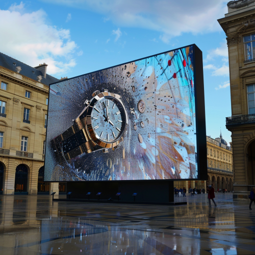 A wrist watch glitching out of a big screen in the middle of place Vendome, super realistic