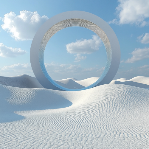 Abstract background with blue andwhite desert waves, and a large round window, rendered in the style of Cinema 4D, with a minimalistic design and simple geometric shapes. A calm landscape with light reflection on the surface of sand, creating a futuristic atmosphere. The blue sky is dotted with clouds, and the natural lighting contributes to the tranquil mood