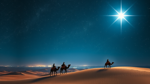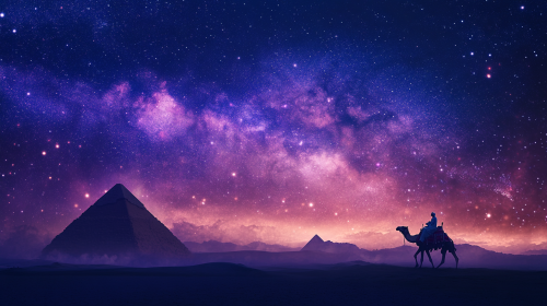 high quality, 4K, realistic photograph of a dark galaxy night sky, below is an Arabian desert, far in the distance a man riding a camel and a pyramid in the background, blurred background. --ar 16:9