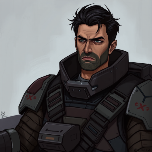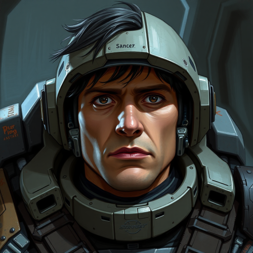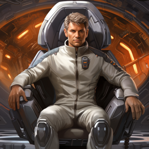 Camera point of view. Realistic. A medium aged male, with dark blonde hair, scar in his cheek, wearing a futuristic grey flightsuit. Spaceship background, sitting in a chair.