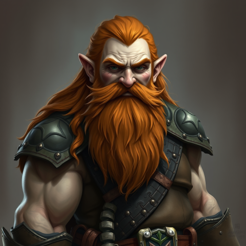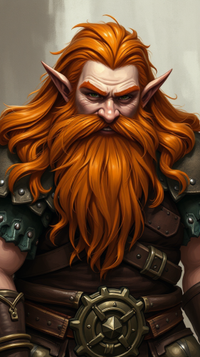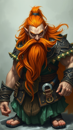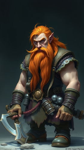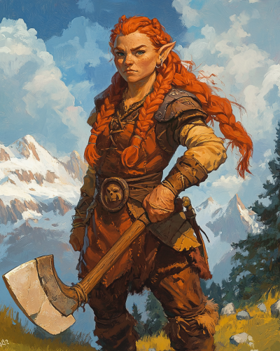A Character for a DnD game. She is a Dwarf just under 5' tall. She has two braids in her red hair. Looks 40 years old with tan skin. She is carrying a great axe looking for a fight. Fantasy illustration in the style of brothers hildebrandt. --aspect 4:5