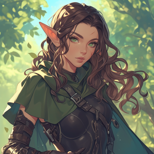 a beautiful female elf from dungeons and dragons, pale skin, long brown hair, pointy elf ears, dark green eyes, wearing leather hunting gear, scar on cheek, daytime wilderness background, dungeons and dragons theme, dungeons and dragons setting --niji 6
