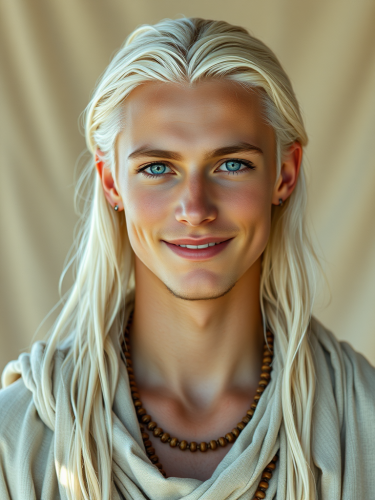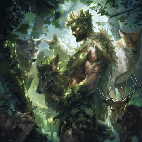 fantasy art of adult male druid in the forest, short gold spiky hair and beard, big and strong body, green and white colors, surrounded by animals and trees, hd, detailed, dark fantasy style, realistic