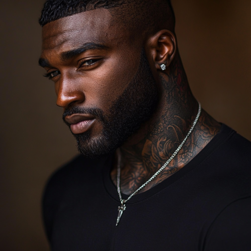 A black DARK Skinned man. He is TALL with close cut, fine silky hair and a full beard. His edge up is sharp and perfect! The lighting highlights his muscular physique. He is handsome with detailed tattoos and a Cuban chain.