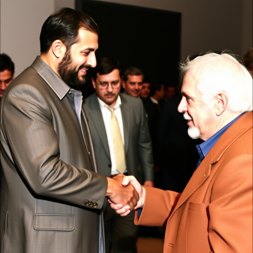 A realistic man smiling confidently, wearing a navy suit with a white shirt, shaking hands with another person in front of a high-end luxury villa. The man's features are sharp and realistic, with subtle lighting highlighting his facial details. The villa is sleek and modern, surrounded by perfectly manicured gardens and a high-end car in the driveway. Style: photorealism, detailed textures, warm lighting, luxury real estate, human realism, natural look, hd quality --ar 16:9 --v 6.0